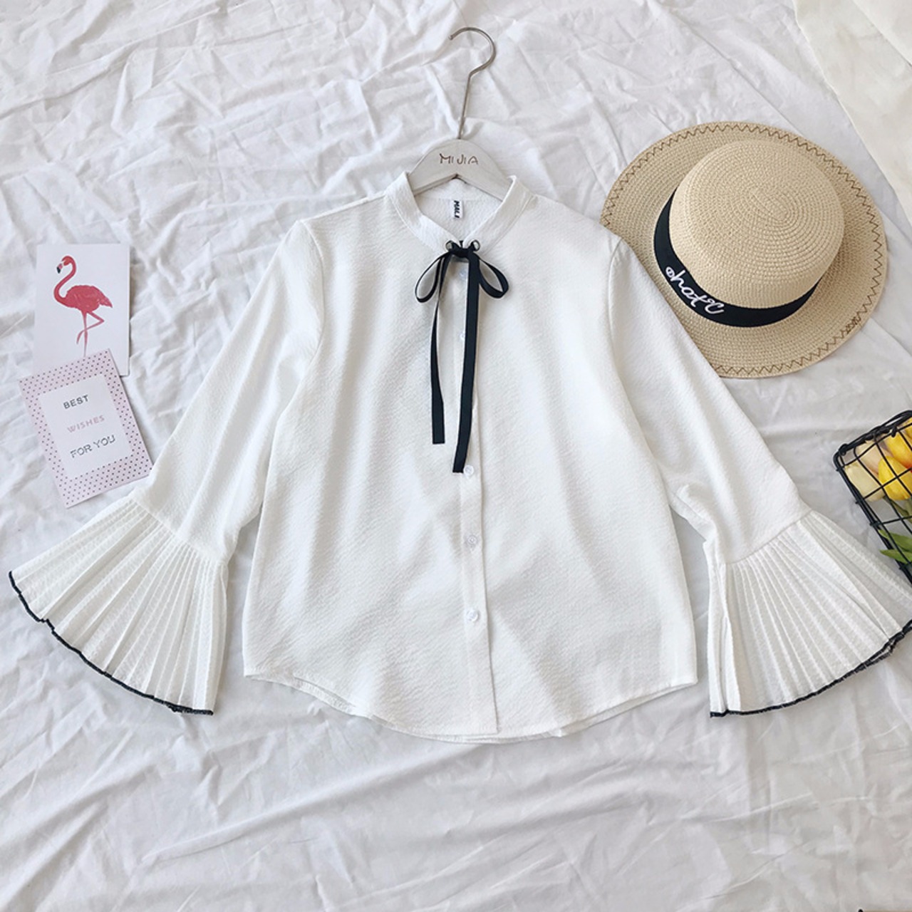 長袖シャツ ブラウス レディースシャツ リボン フレア袖 バイカラーシャツ 蝶結び プリーツ袖 可愛い♬♬