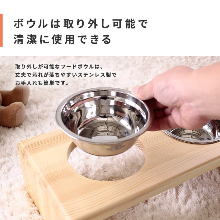 取り外しが可能なフードボウルは、丈夫で汚れが落ちやすいステンレス製でお手入れも簡単です。