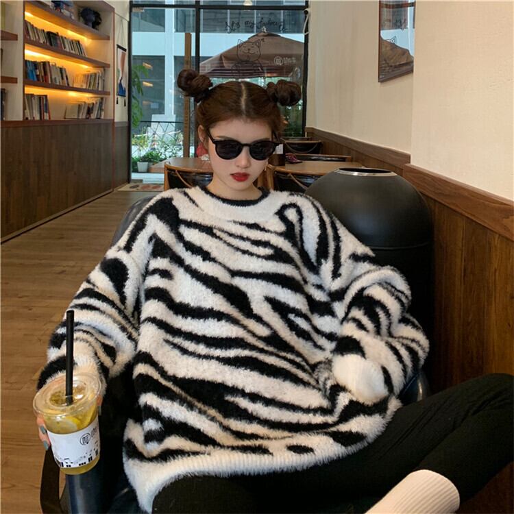 韓国ファッション ゆったりする 怠惰な風 秋冬 セーター ゼブラ柄 中・長セクション